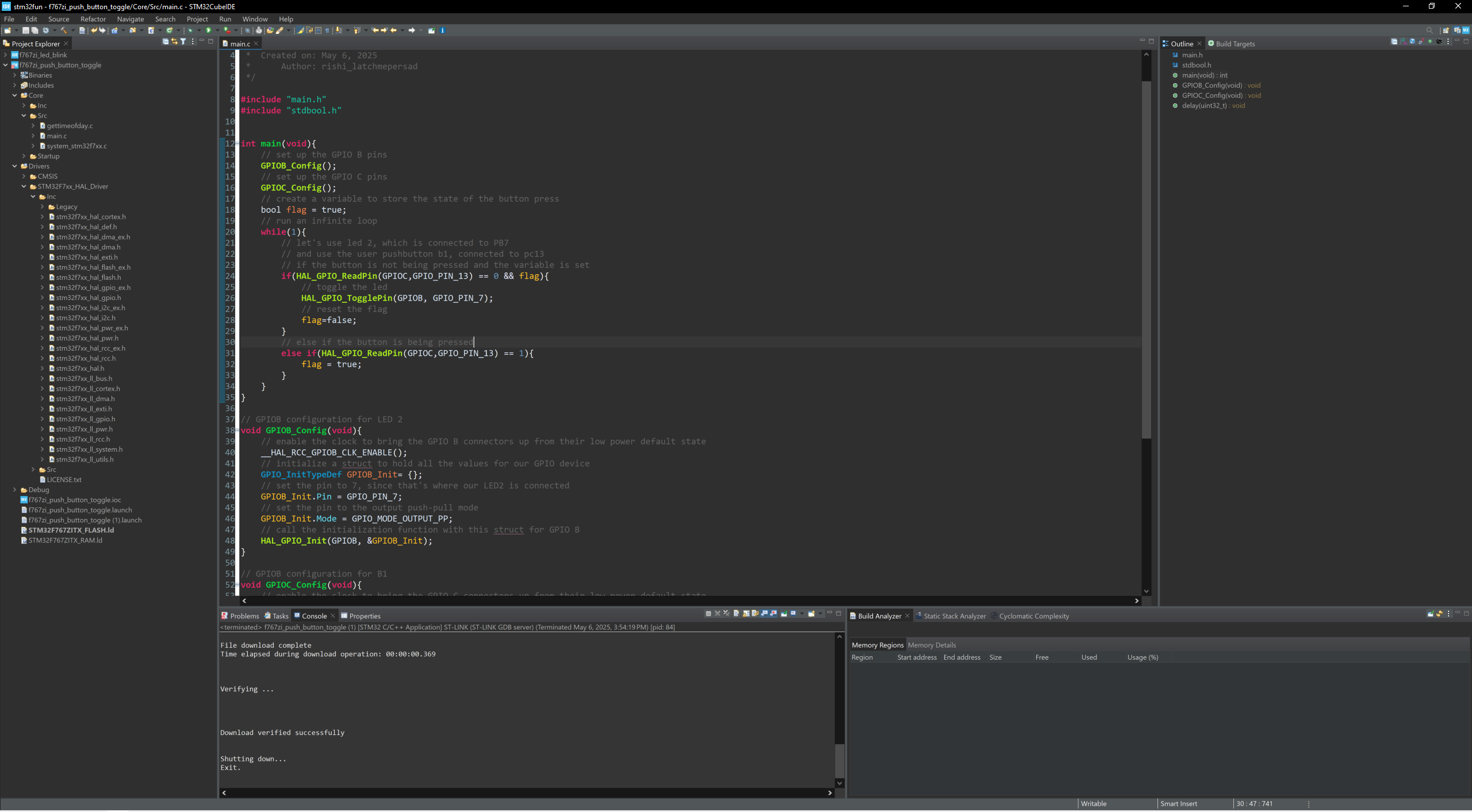 I completed the first 4 videos, which walked me through the basic setup of STM32CubeIDE, and a few basic steps to flash an LED, and use a button toggle to change the state of the LED.