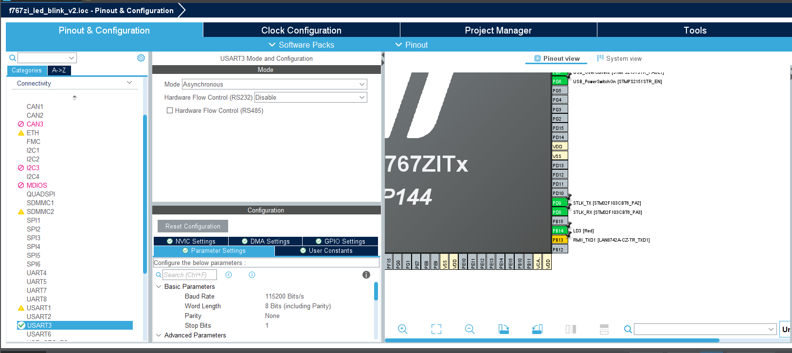 Eventually, I turned to AI. DeepSeek took a look at my code and my setup and suggested a few common troubleshooting steps. Eventually, I realized that somehow the pins for the USART3 interface were not configured automatically on my board through STM32CubeMX.